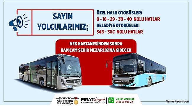 Kurban Bayramı boyunca şehir merkezinin yanı sıra Afşin, Elbistan ve Göksun’da vatandaşlara ücretsiz toplu taşıma hizmeti verecek olan Kahramanmaraş Büyükşehir Belediyesi, ahirete irtihal eden yakınlarını kabirleri başında ziyaret etmek isteyen vatandaşların Kapıçam Şehir Mezarlığı’na ulaşımını sağlamak için de toplu taşıma seferleri düzenleyecek. Bu kapsamda son durağı Necip Fazıl Şehir Hastanesi olan 8 – 18 – 29 – 30 – 40 – 34/B ve 30/C numaralı hatların güzergâhları Kapıçam Şehir Mezarlığı’na kadar uzatıldı. Kurban Bayramı boyunca ücretsiz olarak Kapıçam Şehir Mezarlığı’na ulaşım sağlayacak otobüslerin güzergâh ve hareket saatlerine https://kahramanmaras.bel.tr/toplu-tasima-guzergah-ve-saatleri internet adresinden ve KahramanKart mobil uygulaması üzerinden ulaşılabiliyor.