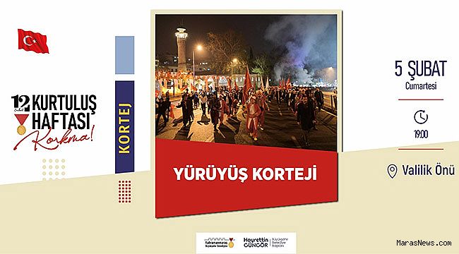 5 Şubat Cumartesi (bugün) gerçekleştirilecek etkinliklerden biri de ‘Maraş Milli Mücadelesi ve Şehrimize Kahramanlık Unvanı Verilişi’ konferansı olacak. Necip Fazıl Kısakürek Kültür Merkezi’nde 20.00’da başlayacak etkinlikte Prof. Dr. Orhan Doğan, Doç. Dr. Mustafa Edip Çelik ve Doç. Dr. Erhan Alparslan, Kahramanmaraş’ın milli mücadelesini anlatacak. Büyükşehir Belediyesi’nden yapılan açıklamada, yürüyüş kortejinin ardından gerçekleştirilecek etkinliğe tüm vatandaşların davetli olduğu belirtildi.