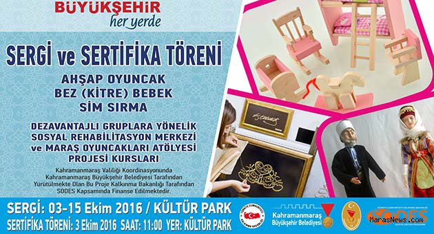 Serginin içeriği ile alakalı bir açıklamada bulunan Kadın ve Aile Şube Müdürü Ayşe Taşkıran: “Müdürlüğümüz bünyesinde SODES Projesi kapsamında Dezavantajlı bireylere yönelik düzenlediğimiz kurslarımızın sonunda hem kursiyerlerimize sertifikalarını takdim edeceğiz, hem de kursiyerlerimizin oluşturduğu ürünleri sergileyeceğiz. Kursiyelerimize kurs süresince verdiğimiz Maraş Oyuncakları Atölyesi, Bez(Kitre) Bebek ve Sim Sırma kurslarımıza katılan kursiyerlerimizin ürettiği ürünleri sergileyeceğiz. Atölyelerimizde kurs gören kardeşlerimizin ürettikleri ahşap oyuncaklar, çocuklarımız açısından daha sağlıklı olmaktadır. Çin malı plastik oyuncaklar yerine daha sağlıklı ve organik ahşap oyuncakları çocuklarımız gönül rahatlığı ile kullanabilirler.
