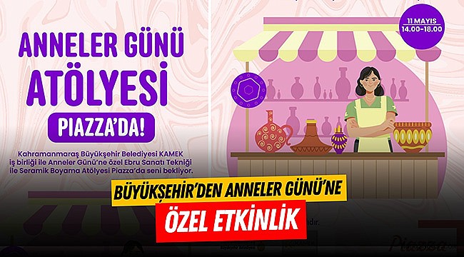 Sosyal belediyecilik çerçevesinde Başkan Fırat Görgel öncülüğünde toplumun tüm kesimlerine yönelik çeşitli programlar gerçekleştiren, daima vatandaşların yanında olan, kişisel gelişimleri noktasında onlarca atölye düzenleyen Kahramanmaraş Büyükşehir Belediyesi, Anneler Günü’nü de unutmuyor. Büyükşehir Belediyesi Meslek Edindirme Kursu (KAMEK) ve Piazza AVM iş birliğiyle 11 Mayıs Cumartesi günü Ebru Sanatı Tekniği ve Seramik Boyama atölyeleri düzenlenecek. 14.00 – 18.00 saatleri arasında Piazza AVM’nin zemin katında düzenlenecek atölyelere başta anneler olmak üzere tüm kadınlar davet edilirken Büyükşehir Belediyesinden yapılan açıklamada, birbirinden eğlenceli ve renkli atölyelerin vatandaşlarla buluşmaya devam edeceği belirtildi.