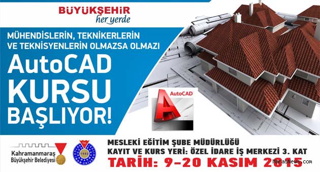 Büyükşehir Belediyesi Sağlık ve Sosyal İşler Dairesi Başkanlığı Mesleki Eğitim Şube Müdürlüğü tarafından verilen autocad kursu 9-20 Kasım 2015 tarihleri arasında gerçekleştirilecek.