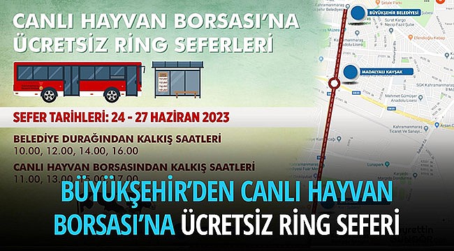 Şehrin tekrar ayağa kaldırılması noktasında tüm alanlarda çalışmalarını kesintisiz sürdüren Kahramanmaraş Büyükşehir Belediyesi, yaklaşan Kurban Bayramı öncesi kurbanlık alacak vatandaşların Canlı Hayvan Borsası’na ulaşımını sağlamak için ücretsiz ring seferleri düzenleneceğini duyurdu. 24 Haziran Cumartesi günü başlayıp 27 Haziran Salı günü akşam saatlerine kadar devam edecek ring seferleri, Büyükşehir Belediyesi’nin karşısındaki otobüs durağından başlayıp Madalya Kavşak ve Otogar istikametini takip ederek Canlı Hayvan Borsası’na ulaşım sağlayacak. Büyükşehir Belediyesi Ana Hizmet Binası karşısındaki duraktan saat 10.00 – 12.00 – 14.00 ve 16.00’da hareket edecek otobüsler, Canlı Hayvan Borsası’ndan 11.00 – 13.00 – 15.00 ve 17.00 saatlerinde geri dönüş yapacak.
