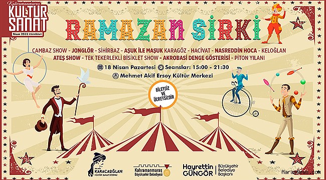 Kahramanmaraş Büyükşehir Belediyesi, etkinliklerine hız kesmeden devam ediyor. Bu kapsamda, 18 Nisan Pazartesi günü Mehmet Akif Ersoy Kültür Merkezi’nde çocuklar ve gençler için birbirinden heyecanlı etkinlikler gerçekleştirilecek. Kurulacak Salon Sirki’nde Jonglör, Sihirbaz, Aşuk ile Maşuk, Karagöz – Hacivat, Nasreddin Hoca, Keloğlan, tek tekerlekli bisiklet show, piton yılanı ve daha birçok gösteri yer alacak. Etkinlikler 15.30 ve 21.30 olmak üzere iki seansta gerçekleştirilecek.