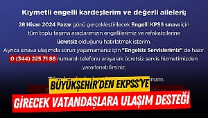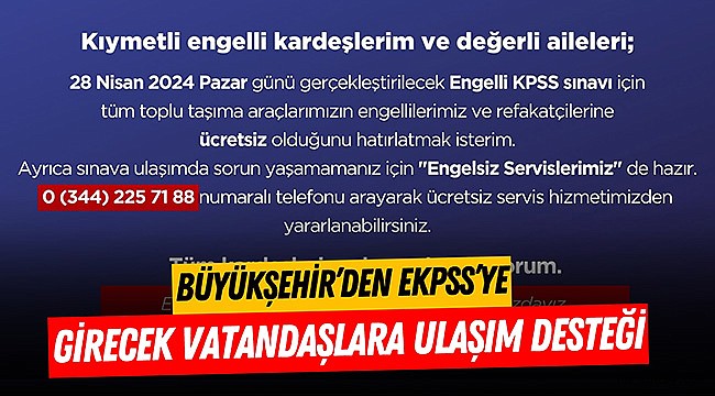 28 Nisan Pazar günü özel gereksinimli vatandaşlar ve refakatçilerine sunulacak hizmetleri sosyal medya hesabından duyuran Büyükşehir Belediye Başkanı Fırat Görgel, “Kıymetli engelli kardeşlerim ve değerli aileleri; 28 Nisan 2024 Pazar günü gerçekleştirilecek EKPSS için tüm toplu taşıma araçlarımızın engellilerimiz ve refakatçilerine ücretsiz olduğunu hatırlatmak isterim. Ayrıca sınava ulaşımda sorun yaşamamanız için ‘Engelsiz Servislerimiz’ de hazır. 0344 225 71 88 numaralı telefonu arayarak ücretsiz servis hizmetimizden yararlanabilirsiniz. Tüm kardeşlerime başarılar diliyorum. Engelsiz bir gelecek için her zaman yanınızdayız” ifadelerini kullandı.