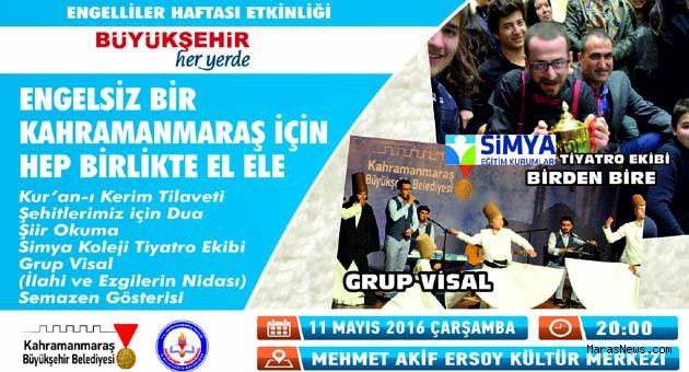 Engelsiz bir Kahramanmaraş için çalışmalarını aralıksız olarak devam ettiren Kahramanmaraş Büyükşehir Belediyesi Engelliler haftası sebebiyle 10-16 Mayıs 2016 tarihleri arasında bir dizi etkinlikler gerçekleştirecek.