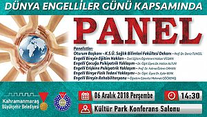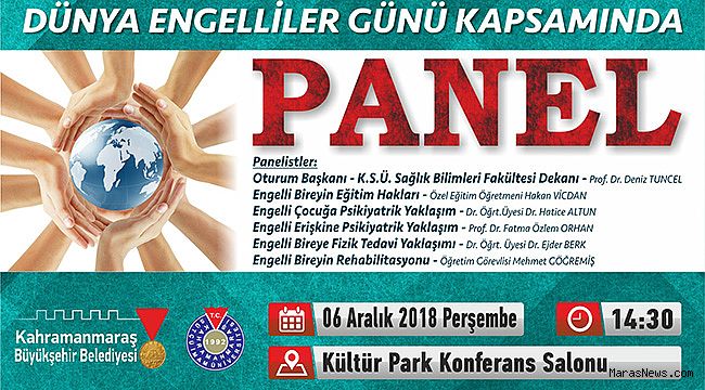 Kahramanmaraş Büyükşehir Belediyesi Engelliler Şube Müdürlüğü’nce yürütülen panelde; Özel Eğitim Öğretmeni Hakan Vicdan; Engelli Bireyin Eğitim Hakları, Öğretim Üyesi Dr. Hatice Altun; Engelli Çocuğa Psikiyatrik Yaklaşım, Prof. Dr. Fatma Özlem Orhan; Engelli, Erişkine Psikiyatrik Yaklaşım, Öğretim Üyesi Dr. Ejder Berk; Engelli Bireye Fizik Tedavi Yaklaşımı ve Öğretim Görevlisi Mehmet Göğremiş; Engelli Bireyin Rehabilitasyonu konularında konuşarak katılımcıları bilgilendirecekler.