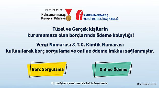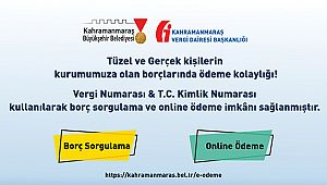 Kahramanmaraş Büyükşehir Belediyesi resmi web sitesi üzerinden borç sorgulamak veya borç ödemek isteyenler: https://kahramanmaras.bel.tr/e-odemelinkinden faydalanabiliyorlar.