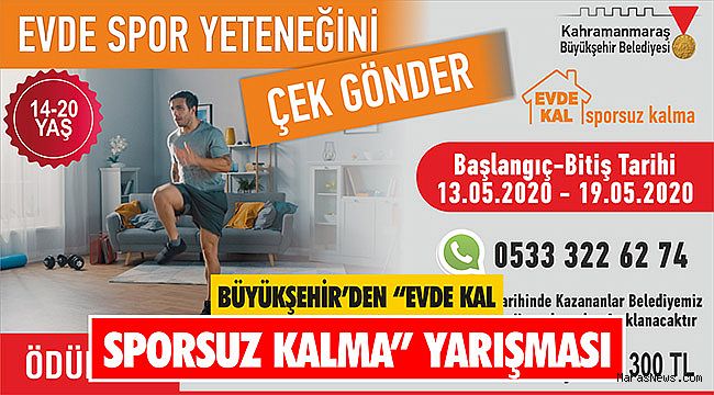 Kahramanmaraş Büyükşehir Belediyesi, koronavirüs tedbirleri kapsamında “Evde kal!” çağrısına yönelik yeni bir yarışma düzenliyor. “Evde kal, sporsuz kalma” ismiyle duyurulan yarışma 13.05.2020-19.05.2020 tarihleri arasında yapılacak. 14-20 yaş grubunun katılabileceği yarışmada, evinde yaptığı sportif etkinliklerin videosunu çekip, Büyükşehir Belediyesi’nin 0533 322 62 74 numaralı WhatsApp hesabına göndererek başvuru yapılmaktadır. Gelen videolar arasından birinci seçilene 1.000 TL, ikinciye 600 TL, üçüncüye 300 TL ödül verilecek. Ödül kazananlar 21.05.2020 tarihinde belediyenin sosyal medya hesaplarından açıklanacaktır.