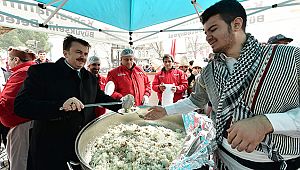 Erkoç, kazanların başına geçerek vatandaşlara kendi elleriyle etli pilav