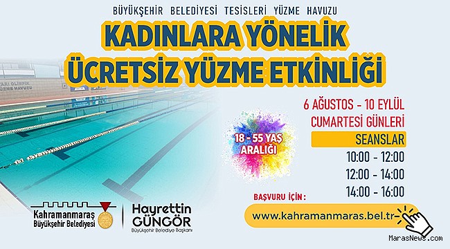 İnsan odaklı sosyal belediyecilik hizmetleri kapsamında şehirde çeşitli etkinlikler gerçekleştiren Kahramanmaraş Büyükşehir Belediyesi, kadınlara yönelik bir projeyi daha hayata geçiriyor. Bu kapsamda, 18 – 55 yaş aralığındaki kadınlara yönelik yüzme etkinliği gerçekleştirilecek. 6 Ağustos – 10 Eylül tarihleri arasında Cumartesi günleri düzenlenecek etkinlikler 10.00 – 12.00, 12.00 – 14.00 ve 14.00 – 16.00 saatleri arasında üç seans olarak katılımcılarla buluşacak. Ücretsiz olarak gerçekleştirilecek etkinlikte katılımcılara bone de hediye edilecek. Büyükşehir Belediyesi Tesisleri Yüzme Havuzu’nda sınırlı sayıda katılımcıyla gerçekleştirilecek etkinliğine https://kahramanmaras.bel.tr/form/bayanlara-yonelik-yuzme-etkinligi-basvuru-formu internet adresi üzerinden başvuru yapılabiliyor. Büyükşehir Belediyesi’nden yapılan açıklamada, yüzme etkinliğine ilişkin detaylı bilgiye 0553 041 53 53 numaralı WhatsApp danışma hattı üzerinden ulaşılabileceği belirtildi.