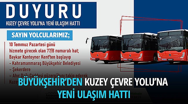 Vatandaşların toplu taşıma ihtiyacını karşılamak ve toplu ulaşımda konforu artırmak için faaliyetlerini sürdüren Kahramanmaraş Büyükşehir Belediyesi, şehrin yeni yerleşim alanlarından Kuzey Çevre Yolu civarına yeni toplu ulaşım hattını hizmete alıyor. 10 Temmuz Pazartesi günü hizmete girecek olan 77/B numaralı hat; Baykar Konteyner Kent’ten başlayıp Kahramanmaraş Büyükşehir Belediyesi – Şekerdere – Ahır Dağı Caddesi güzergâhını takip ederek Kuzey Çevre Yolu’na ulaşım sağlayacak. Büyükşehir Belediyesi’nden yapılan açıklamada; 10 Temmuz Pazartesi günü hizmete girecek 77/B numaralı hat ve şehir içi ulaşım hizmeti veren tüm toplu taşıma araçlarının güzergâh ve hareket saatine https://kahramanmaras.bel.tr/toplu-tasima-guzergah-ve-saatleri internet adresi ve KahramanKart mobil uygulaması üzerinden ulaşılabileceği, toplu taşımaya ilişkin 0531 082 00 22 numaralı WhatsApp hattından bilgi alınabileceği belirtildi.
