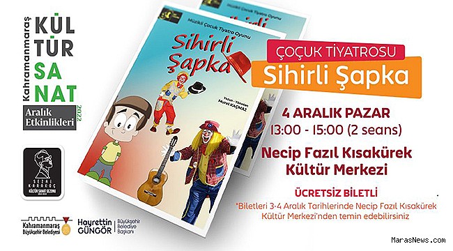 Sezai Karakoç Kültür Sanat Sezonu’nda yetişkinlere yönelik kolokyum, konferans ve söyleşi gibi çeşitli etkinlikler düzenleyen Kahramanmaraş Büyükşehir Belediyesi, minikleri de birbirinden eğlenceli ve öğretici tiyatro gösterileriyle buluşturmayı sürdürüyor. Etkinlik takvimi kapsamında, 4 Aralık Pazar günü Sihirli Şapka adlı müzikli tiyatro gösterisi Necip Fazıl Kısakürek Kültür Merkezi’nde çocuklar için perdelerini açacak. İyilik ve dürüstlüğü ön plana çıkaran, çocukların iyi alışkanlıklar edinmesine yardımcı olmayı hedefleyen tiyatro gösterisi, saat 13.00 ve 15.00 olmak üzere 2 seans şeklinde miniklerle buluşacak. Ücretsiz olarak sahnelenecek gösterinin biletleri, 3 ve 4 Aralık tarihlerinde Necip Fazıl Kısakürek Kültür Merkezi’nden temin edilebilecek. Büyükşehir Belediyesi’nden yapılan açıklamada, gösteriye tüm çocukların davetli olduğu belirtildi.