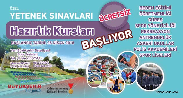 Konu ile ilgili olarak Gençlik ve Spor Şube Müdürlüğü’nden yapılan yazılı açıklamada: “Özel Yetenek Sınavlarına Hazırlık kursu 26.04.2016 tarihinde Gençlik ve Spor Şube Müdürlüğünün koordinesinde Büyükşehir Belediyesi Spor tesislerinde başlıyor. Sosyal Belediyecilik anlayışı kapsamında ücretsiz olarak yapılacak kurslara herkes başvurabilir. Kurslar aşağıda sıralanan branşları kapsamaktadır.