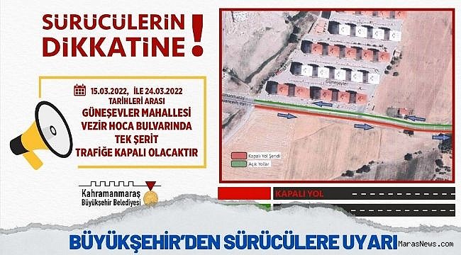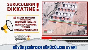 Kahramanmaraş Büyükşehir Belediyesi ekipleri tarafından, Dulkadiroğlu Güneşevler Mahallesi’nde kanalizasyon hattı çalışmaları gerçekleştiriliyor. Bu kapsamda, Ulaşım Hizmetleri Dairesi Başkanlığı tarafından alınan karar doğrultusunda Vezir Hoca Bulvarı’nın tek şeridi 15 - 24 Mart tarihleri arasında trafiğe kapalı olacak. Ulaşım Hizmetleri Dairesi Başkanlığı’ndan yapılan açıklamada, “Büyükşehir Belediyesi ekiplerimiz tarafından Vezir Hoca Bulvarı’nda bir dizi çalışma gerçekleştiriliyor. Bu kapsamda, 24 Mart tarihine kadar bulvardaki tek şerit ulaşıma kapatılmıştır. Vatandaşlarımızın trafikte dikkatli olmaları önem arz etmektedir” ifadelerine yer verildi.