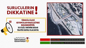 Kahramanmaraş Büyükşehir Belediyesi, alınan UKOME kararı doğrultusunda Türkoğlu ilçesi Kuyumcular Mahallesi’nde bulunan köprünün 30 Eylül Cuma gününe kadar trafiğe kapalı olacağını duyurdu. Ulaşım Dairesi Başkanlığı’ndan karara ilişkin yapılan açıklamada, “Fen İşleri Dairesi Başkanlığı koordinesindeki ekipler tarafından Türkoğlu ilçesi Kuyumcular Mahallesi’nde gerçekleştirilen köprü yapım çalışmaları nedeniyle bölgede bulunan ve ulaşımda aktif olarak kullanılan köprü, 30 Eylül Cuma gününe kadar trafiğe kapalı olacaktır. Vatandaşlarımızın ulaşımda alternatif güzergâhlara yönelmeleri önem arz etmektedir” ifadelerine yer verildi.