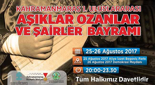Kültür ve Turizm Bakanlığı, Kahramanmaraş Büyükşehir Belediyesi ve Halk Ozanları Kültür ve Dayanışma Derneği işbirliği ile gerçekleştirilecek Kahramanmaraş 1. Uluslararası Aşıklar Ozanlar ve Şairler Bayramı Elbistan, Göksun, Onikişubat ve Dulkadiroğlu ilçelerinde 25-27 Ağustos 2017 tarihleri arasında gerçekleştirilecek.