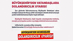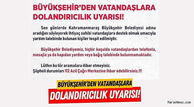Kahramanmaraş Büyükşehir Belediyesi, dolandırıcılık girişimlerine karşı vatandaşları uyardı. Büyükşehir Belediyesinden yapılan açıklamada, son günlerde bazı kişilerin, Büyükşehir Belediyesi adına ihtiyaç sahibi vatandaşlar için yardım veya bağış talebinde bulunduğunun tespit edildiği belirtildi. Açıklamada, “Son günlerde Kahramanmaraş Büyükşehir Belediyesi adına aradığını söyleyerek ihtiyaç sahibi vatandaşlara destek olmak amacıyla yardım talebinde bulunan kişiler tespit edilmiştir. Gerekli hukuki süreç başlatılmış olup Belediyemiz, hiçbir koşulda vatandaşlardan telefonla, mesajla ya da kapıdan yardım veya bağış talebinde bulunmamaktadır. Lütfen bu tür aramalara itibar etmeyiniz” ifadelerine yer verildi. Ayrıca, vatandaşların şüpheli durumları 112 Acil Çağrı Merkezine ihbar etmeleri istendi.