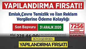 Kahramanmaraş Büyükşehir Belediyesi, ‘7256 Sayılı Bazı Alacakların Yeniden Yapılandırılması Kanunu’ kapsamında tüm vergi kalemlerinde vatandaşlara kolaylık sağlıyor. Taksitli ödeme seçeneğinin de yer aldığı yeni düzenlemede peşin ödemelerde, farklı kalemlerde %90’a varan indirimler yapılıyor. Konu ile ilgili olarak Mali Hizmetler Dairesi Başkanlığı tarafından yapılan açıklamada, “Yapılandırma başvuruları 31 Aralık Perşembe gününe kadar devam edecek. Ayrıntılı bilgi için vatandaşlarımız 0344 228 46 00 numaralı telefonu arayabilir” ifadeleri kullanıldı.