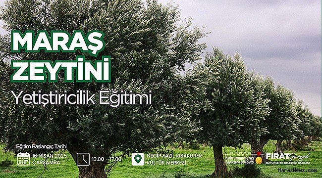 Maraş Zeytini yetiştiriciliği eğitimi, 16 Nisan 2025 Çarşamba günü Necip Fazıl Kısakürek Kültür Merkezi’nde gerçekleştirilecek. Saat 13.00 – 17.00 arasında düzenlenecek eğitimde, zeytin tarımı alanında uzman akademisyenler ve teknik personel üreticilerle buluşacak. Katılımcılar, teorik bilgilerin yanı sıra pratikte uygulanabilecek yöntemler konusunda da bilgilendirilecek.