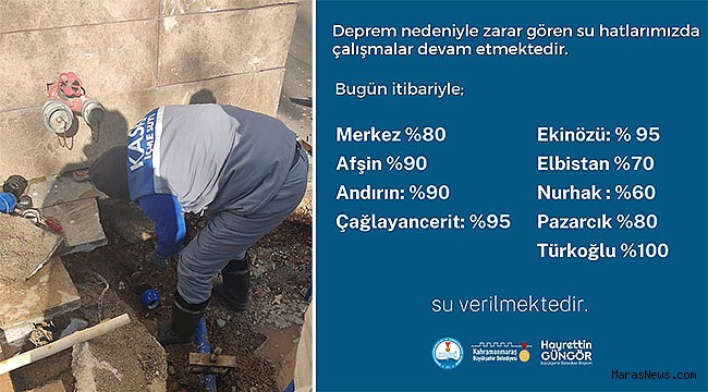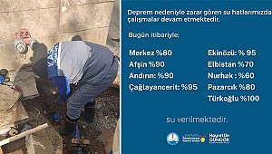 Kahramanmaraş Büyükşehir Belediyesi, 6 Şubat Pazartesi günü meydana gelen deprem sonrası içme suyu hatlarında meydana gelen tahribatları onarmak için çalışmalarını aralıksız sürdürüyor. Yoğun bir şekilde devam eden çalışmalar neticesinde yerleşim yerlerinin içme suyu ihtiyacı büyük ölçüde karşılanıyor. Bugün itibariyle şehir merkezinde yüzde 80, Türkoğlu’nda yüzde 100, Ekinözü ve Çağlayancerit’te yüzde 95, Afşin ve Andırın’da yüzde 90, Pazarcık’ta yüzde 80, Elbistan’da yüzde 70 ve Nurhak’ta yüzde 60 oranında içme suyu sağlanıyor. Büyükşehir Belediyesi’nden yapılan açıklamada, yoğun bir şekilde devam eden çalışmaların kısa süre içerisinde tamamlanmasıyla yerleşim yerlerinin tamamının içme suyu ihtiyacının karşılanacağı belirtildi.