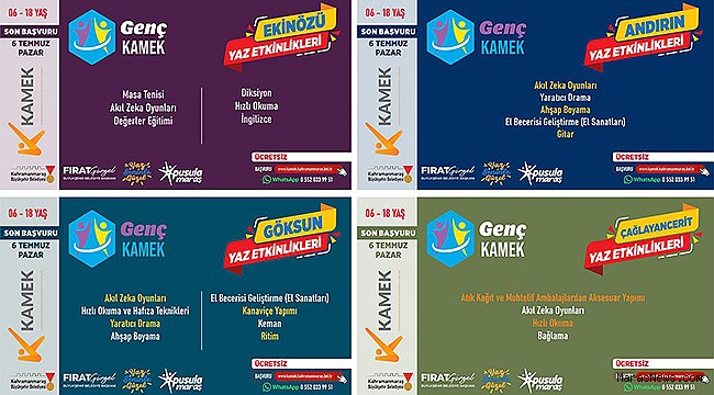 Yaz tatilini verimli, üretken ve eğitici faaliyetlerle değerlendirmek isteyen gençler için Ekinözü, Göksun, Andırın ve Çağlayancerit’te Kahramanmaraş Büyükşehir Belediyesi tarafından düzenlenecek olan yaz kurslarına başvurular tüm hızıyla devam ediyor. 6 – 18 yaş aralığındaki çocuk ve gençlere yönelik hazırlanan eğitim programları, alanında uzman eğitmenler eşliğinde gerçekleştirilecek. Kurslara katılan gençler hem yeni beceriler kazanacak hem de eğlenceli bir yaz tatili geçirecek. Tamamen ücretsiz olarak sunulan bu eğitimlere başvurular, 6 Temmuz Pazar akşamına kadar çevrimiçi olarak alınacak. Başvuru yapmak isteyenler, https://kahramanmaras.bel.tr/duyuru/2025/06/27/genc-kamek-ilce-kurslari-basvurusu adresinden işlemlerini gerçekleştirebilecek.