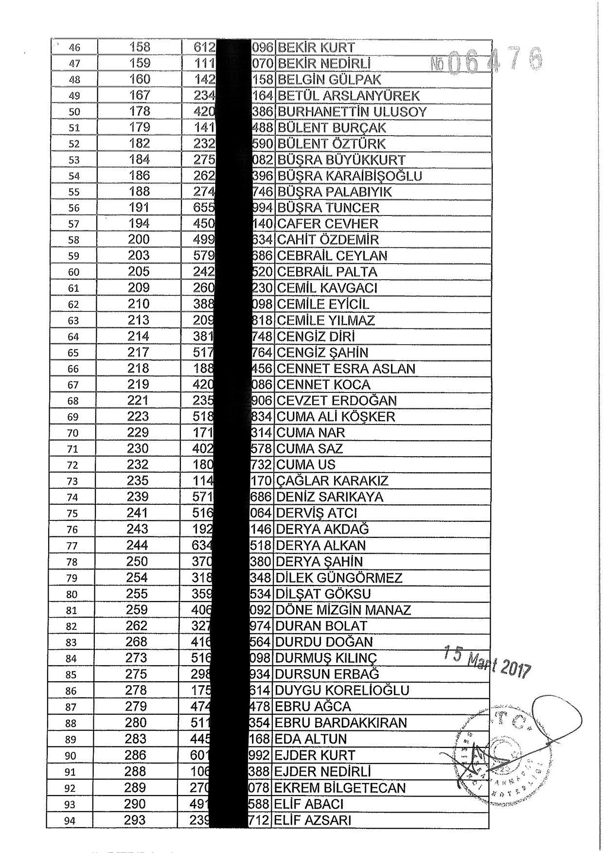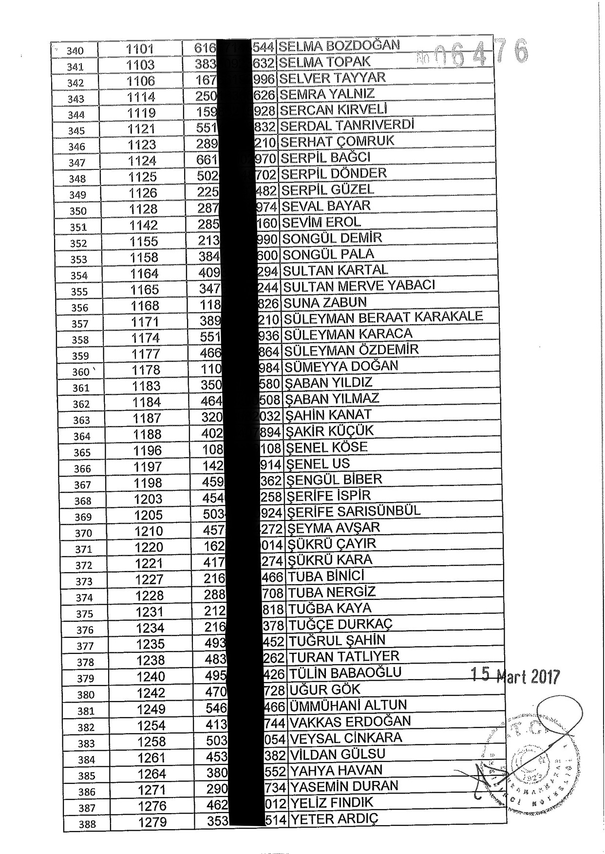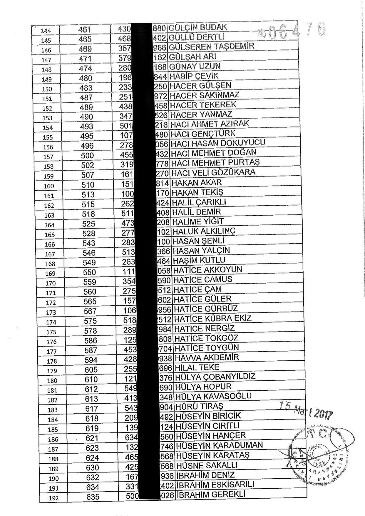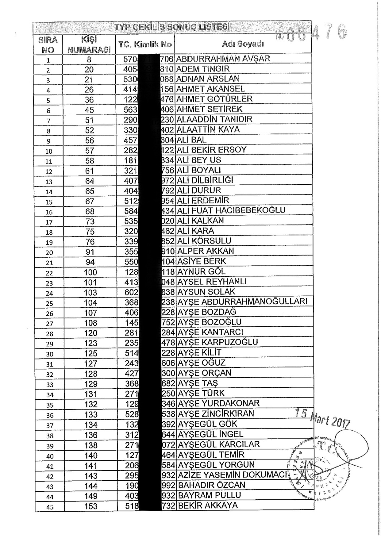 15 Mart 2017 Çarşamba günü yapılan kur’a çekimi sonunda 20 Mart 2017 Pazartesi günü işbaşı yapması beklenen 400 işçinin ismi şu şekilde: