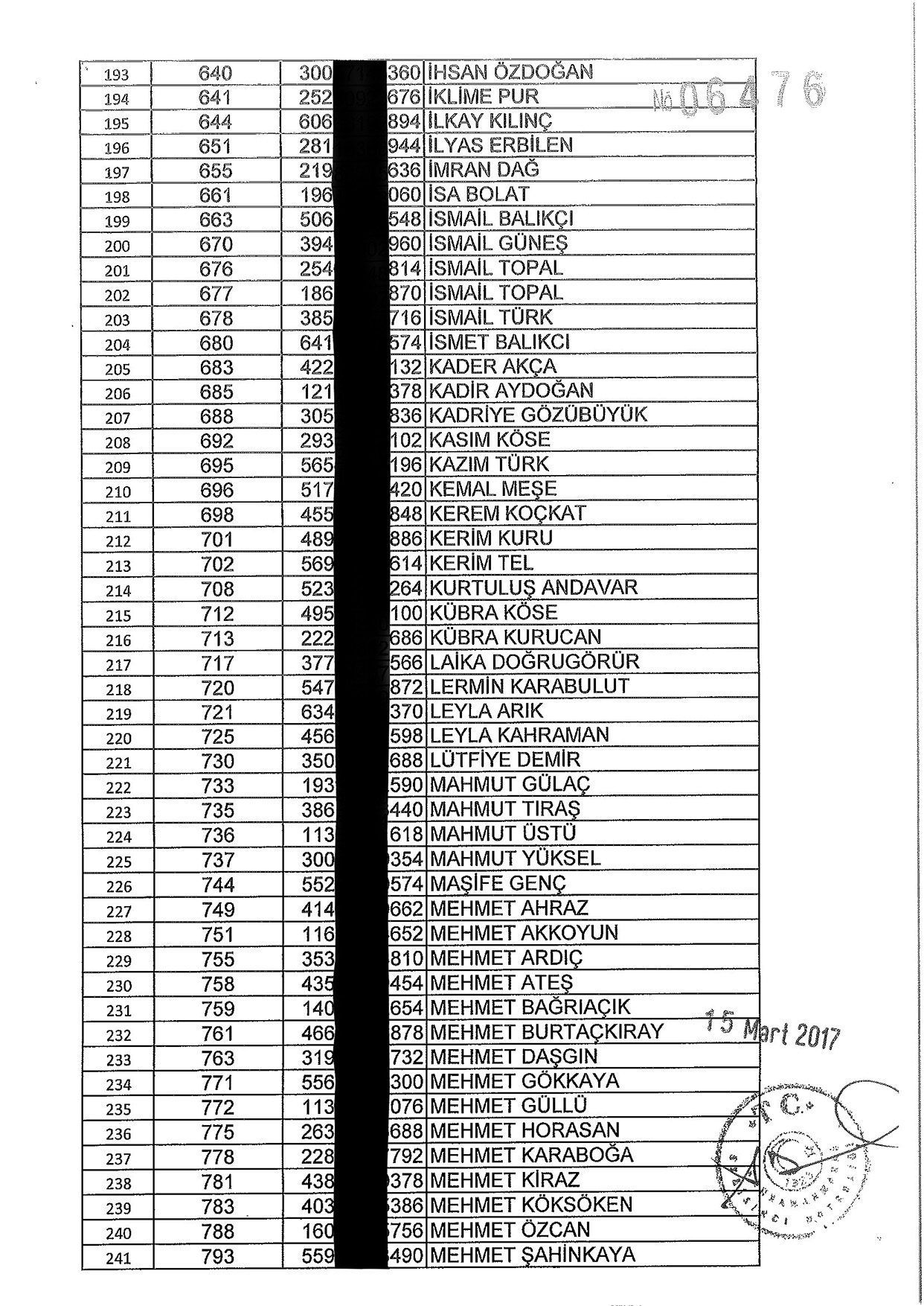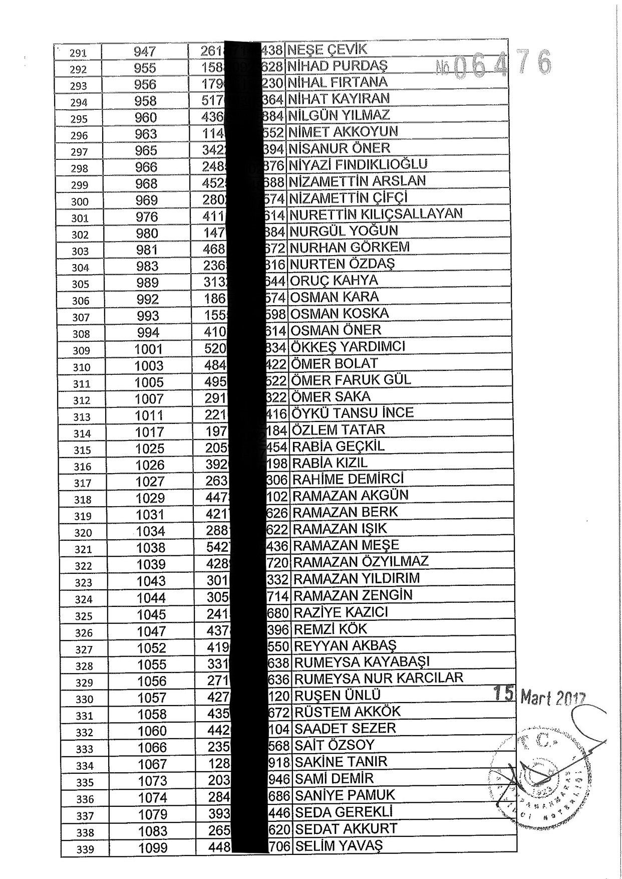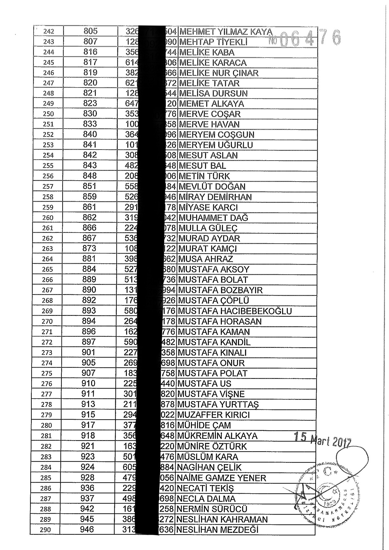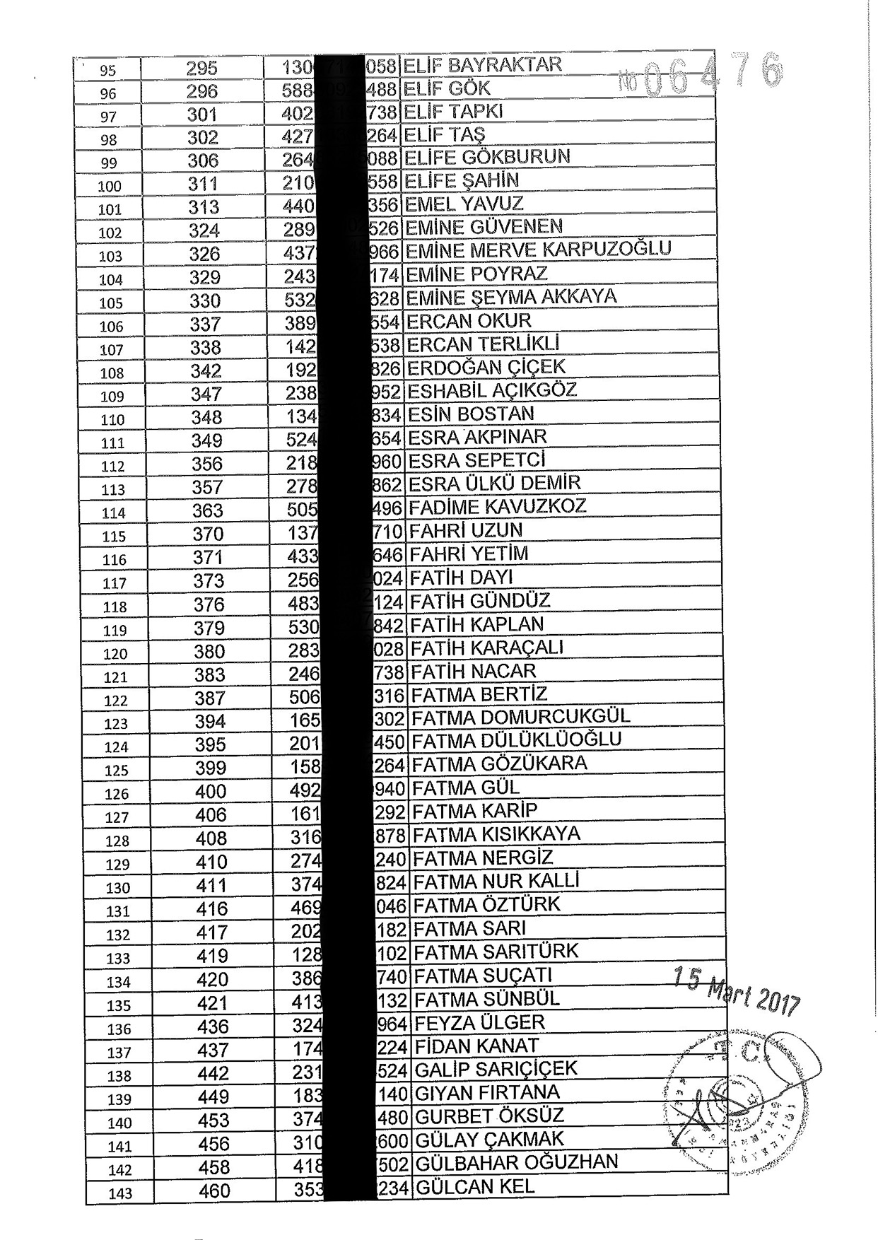 15 Mart 2017 Çarşamba günü yapılan kur’a çekimi sonunda 20 Mart 2017 Pazartesi günü işbaşı yapması beklenen 400 işçinin ismi şu şekilde: