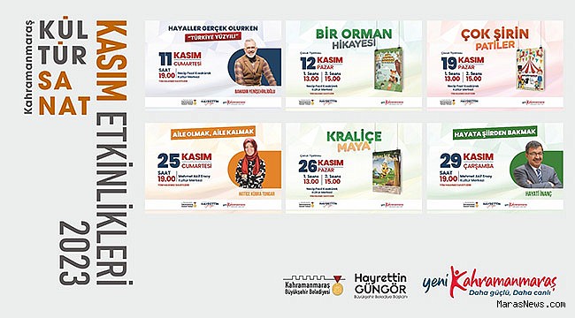 Büyükşehir Belediyesinin Kasım kültür sanat etkinlikleri, 29 Kasım Çarşamba günü Eğitimci – Yazar Hayati İnanç’ın katılımıyla gerçekleştirilecek ‘Hayata Şiirden Bakmak’ konulu söyleşiyle noktalanacak. Mehmet Akif Ersoy Kültür Merkezi’nde gerçekleştirilecek etkinlik saat 19.00’da başlayacak. Büyükşehir Belediyesinden yapılan açıklamada, Kasım ayı içerisinde ücretsiz olarak düzenlenecek etkinliklere tüm vatandaşların davetli olduğu ve Kasım Kültür Sanat Takvimi’ne https://kahramanmaras.bel.tr/duyuru/2023/11/06/kasim-ayi-kultur-sanat-takvimi internet adresinden ulaşılabileceği belirtildi.