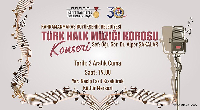 Kahramanmaraş Büyükşehir Belediyesi, sosyal belediyecilik hizmetleri çerçevesinde çeşitli etkinlikleri vatandaşlarla buluşturmayı sürdürüyor. Büyükşehir Belediyesi bünyesinde kurulan ve ilk kez Ekim ayında dinleyici karşısına çıkan Türk Halk Müziği Korosu, 2 Aralık Cuma günü ikinci kez sahne alacak. Necip Fazıl Kısakürek Kültür Merkezi’nde gerçekleştirilecek konser, saat 19.00’da başlayacak. Sütçü İmam Üniversitesi Güzel Sanatlar Fakültesi Öğr. Gör. Dr. Alper Şakalar şefliğinde gerçekleştirilecek konserde koro; Anadolu’nun farklı yörelerinden birbirinden değerli eserleri müzikseverler için seslendirecek. Büyükşehir Belediyesi’nden yapılan açıklamada, tüm müzikseverlerin konsere davetli olduğu belirtildi.