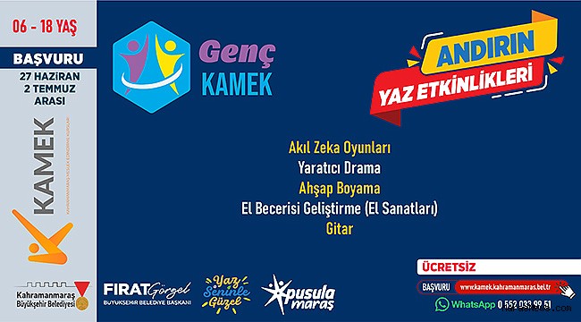 Büyükşehir Belediyesinin gençlere sunduğu bu ücretsiz yaz kurslarına başvurular, 2 Temmuz Çarşamba günü saat 17.00’a kadar çevrimiçi olarak alınacak. Başvuru yapmak isteyen gençler, https://kamek.kahramanmaras.bel.tr adresi üzerinden işlemlerini kolaylıkla tamamlayabiliyor.