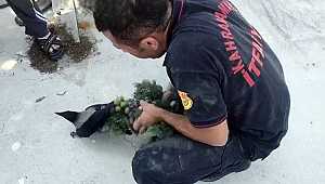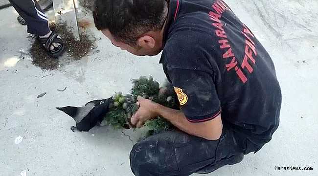 Kuşun bulunduğu yerden kurtardı. Ayağına dolanan ipi çıkartan itfaiyeciler