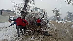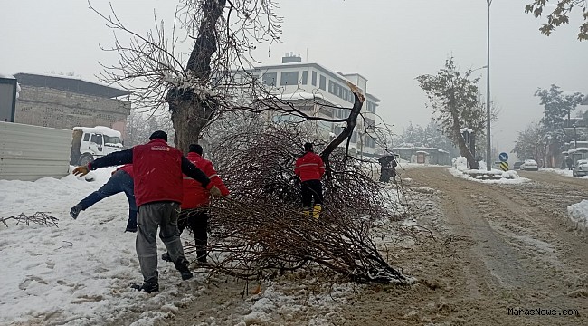 Kahramanmaraş Büyükşehir Belediyesi, olumsuz hava koşullarının şehir yaşamını etkilememesi adına sahadaki çalışmalarını aralıksız sürdürüyor. Kar küreme, tuzlama ve solisyon uygulamalarını eş zamanlı yürüten Büyükşehir Belediyesi, kar yağışı neticesinde zarar gören ağaç dallarının oluşturabileceği risklere karşı da kapsamlı bir çalışma yürütüyor. Kent Estetiği ve Yeşil Alanlar Dairesi Başkanlığı ekipleri, ağaçlarda meydana gelen kırılma ve sarkmalara karşı hızlı bir şekilde harekete geçti. Karın ağırlığıyla kırılan ya da düşme riski taşıyan dallar, ekipler tarafından titizlikle toplanarak olası tehlikelerin önüne geçiliyor. Yapılan müdahalelerle hem yaya güvenliği hem de araç trafiği açısından risk oluşturan unsurlar ortadan kaldırılıyor. Çalışmalar kapsamında parklar, bahçeler, refüjler, kaldırımlar ve ana arterler başta olmak üzere vatandaşların yoğun olarak kullandığı alanlara öncelik veriliyor. Ekipler, günlük yaşamın aksamaması ve olası kazaların yaşanmaması için şehir genelinde eş zamanlı olarak görev yapıyor. Özellikle yaya trafiğinin yoğun olduğu bölgelerde kırılan dalların hızla kaldırılmasıyla güvenli bir çevre oluşturuluyor.