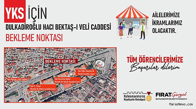 8 ve 9 Haziran tarihlerinde Yükseköğretim Kurumları Sınavı’na (YKS) girecek adaylara ücretsiz ulaşım desteğini açıklayan Kahramanmaraş Büyükşehir Belediyesi, velilere yönelik de anlamlı bir uygulama yapıyor. Büyükşehir Belediyesince Kahramanmaraş Sütçü İmam Üniversitesi Avşar Kampüsü ve Dulkadiroğlu Hacı Bektaş-ı Veli Caddesi’ne “Bekleme Alanı” oluşturuldu. Veliler, sınava giren çocuklarını oluşturulan alanlarda bekleme imkânı bulurken vatandaşlara çay, simit ve su ikramı da yapılacak. Ayrıca Büyükşehir Belediyesinin mobil ekipleri sınav süresince sahada olarak sınav merkezlerinde velilere çay, simit ve su ikramında bulunacak.