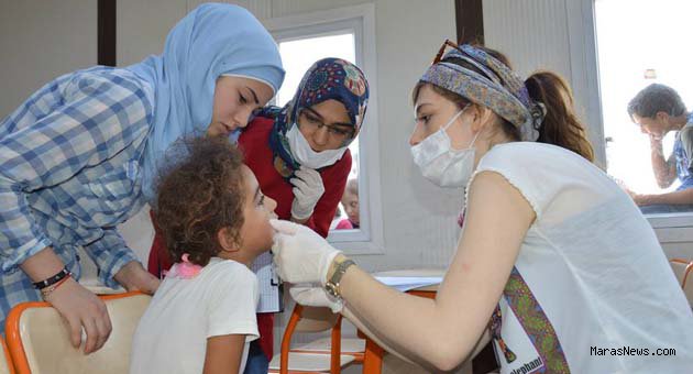 Türkiye’nin değişik üniversitelerinden gelen diş hekimliği fakültesi öğrencileri, sağlık yüksekokulu ebelik-hemşirelik öğrencileri ve Kahramanmaraş Halk Sağlığı Müdürlüğü personellerinden Prof. Dr. Ç. Türksel Dülgergil başkanlığında, Çadırkent Konaklama Tesislerinde bulunan Suriyeli Mülteci çocukların ağız ve diş bakımlarını yaptı. Ağız ve diş sağlığı bakımı programı kapsamında 12-36 ayılık bebeklere flor vernik 4-15 yaş arası çocuklara flor jel uygulandı. Ayrıca ihtiyaç duyulan çocuklarda dolgu tedavisi de yapıldı.