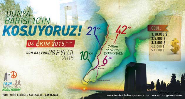 Gelibolu Yarımadası Tarihi Milli Parkı’nda 4 Ekim 2015 tarihinde düzenlenecek ‘Dünya Barışı İçin Koşuyoruz’ etkinliğinde 42 kilometre 195 metre mesafede maraton, 21 kilometre 100 metre mesafede yarı maraton ve 8 kilometre mesafede ise Halk koşusu gerçekleştirilecek.