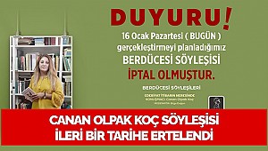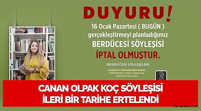 Kahramanmaraş Büyükşehir Belediyesi, Sezai Karakoç Kültür Sanat Sezonu kapsamında 16 Ocak Pazartesi günü (bugün) Yedi Güzel Adam Edebiyat Müzesi’nde saat 19.00’da düzenlenmesi planlanan Akademisyen – Yazar Doç. Dr. Canan Olpak Koç ile Berdücesi Söyleşileri etkinliğinin olumsuz hava koşulları nedeniyle ileri bir tarihe ertelendiğini duyurdu. Büyükşehir Belediyesi’nden yapılana açıklamada, “Bugün Doç. Dr. Canan Olpak Koç’un katılımıyla düzenlenmesi planlanan ‘Edebiyat İtibarın Neresinde’ konulu söyleşi etkinliği, yaşanan hava muhalefeti nedeniyle ileri bir tarihe ertelenmiştir” ifadelerine yer verildi.
