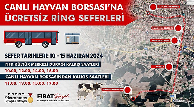 Yaklaşan Kurban Bayramı öncesi şehirde hazırlıklarını hummalı bir şekilde sürdüren Kahramanmaraş Büyükşehir Belediyesi, kurbanlık alacak vatandaşların Canlı Hayvan Borsası’na ulaşımını sağlamak için ücretsiz ring seferlerinin başladığını duyurdu. 15 Haziran’a kadar devam edecek ücretsiz ring seferleri; Necip Fazıl Kısakürek Kültür Merkezi önünden başlayıp Büyükşehir Belediyesi, Madalyalı Kavşak, Şehirler Arası Otobüs Terminali güzergâhını takip ederek Canlı Hayvan Borsası’na ulaşım sağlayacak. Necip Fazıl Kısakürek Kültür Merkezi önünden 10.00 – 12.00 – 14.00 ve 16.00 saatlerinde hareket edecekler otobüsler; 11.00 – 13.00 – 15.00 ve 17.00 saatlerinde ise Canlı Hayvan Borsası’ndan geri dönüş yapacak. Büyükşehir Belediyesinden yapılan açıklamada, toplu ulaşım ile ilgili 0531 082 00 22 numaralı WhatsApp hattından bilgi alınabileceği belirtildi.