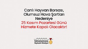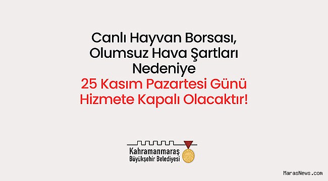 Olumsuz hava şartları nedeniyle meydana gelen aksamaların önüne geçerek herhangi bir can ve mal kaybının yaşanmaması için yoğun gayretini sürdüren Kahramanmaraş Büyükşehir Belediyesi, hava muhalefeti nedeniyle Canlı Hayvan Borsası’nın da 25 Kasım Pazartesi günü hizmete kapalı olacağını duyurdu. Büyükşehir Belediyesinden yapılan açıklamada, “Canlı Hayvan Borsası, olumsuz hava şartları nedeniyle 25 Kasım Pazartesi günü hizmete kapalı olacaktır” ifadelerine yer verildi.