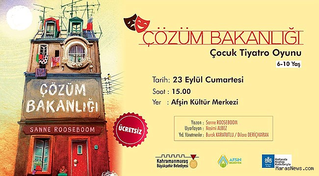 Şehrin tekrar ayağa kaldırılması noktasında tüm alanlarda faaliyetlerini sürdüren Kahramanmaraş Büyükşehir Belediyesi, sosyal belediyecilik hizmetleri çerçevesinde de çeşitli etkinlikleri vatandaşlarla buluşturmaya devam ediyor. Hollanda Büyükelçiliği iş birliğiyle hayata geçirilen proje kapsamında ilk olarak Necip Fazıl Kısakürek Kültür Merkezi’nde sahnelenen ve büyük beğeni kazanan ‘Çözüm Bakanlığı’ adlı tiyatro gösterisi, 23 Eylül Cumartesi günü Göksun ve Afşin’de sahne alacak. İlham verici, eğlenceli ve macera dolu hikâyesiyle akran zorbalığına göğüs geren bir grup arkadaşın yaşadığı olayları konu alan oyun; saat 11.00’da Göksun Kültür Merkezi, saat 15.00’da ise Afşin Kültür Merkezi’nde çocuklar için perdelerini açacak. Ücretsiz olarak sahnelenecek gösteriye tüm çocuklar davet edildi. Dış İlişkiler Dairesi Başkanlığı’ndan yapılan açıklamada, Hollandalı çocuk edebiyatı yazarı Sanne Rooseboom’in kaleme aldığı eserden sahneye uyarlanan ‘Çözüm Bakanlığı’ adlı tiyatro gösterisinin şehrin farklı noktalarında çocuklarla bir araya gelmeye devam edeceği belirtildi.