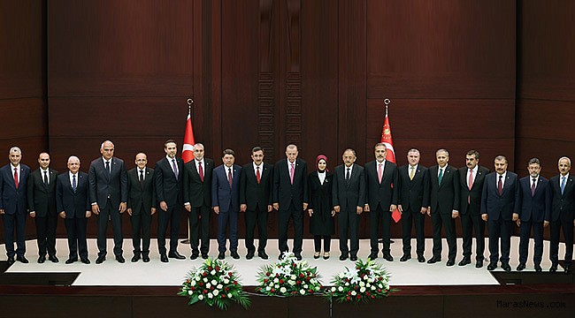 Yeni kabineyi açıklamadan önce şimdiye kadar beraber çalıştıkları, nice sorunu birlikte çözdükleri, nice badireyi beraber aştıkları eski kabine üyelerine teşekkür eden Cumhurbaşkanı Erdoğan, “Şimdi sizlerle Türkiye Yüzyılı hedeflerimize ulaşmak için birlikle yol yürüyeceğimiz yeni kabine üyelerimizi paylaşmak istiyorum” diyerek, Cumhurbaşkanı Yardımcısı’nın Cevdet Yılmaz, Adalet Bakanı’nın Yılmaz Tunç, Aile ve Sosyal Hizmetler Bakanı’nın Mahinur Özdemir Göktaş, Çalışma ve Sosyal Güvenlik Bakanı’nın Vedat Işıkhan, Çevre, Şehircilik ve İklim Değişikliği Bakanı’nın Mehmet Özhaseki, Dışişleri Bakanı’nın Hakan Fidan, Enerji ve Tabii Kaynaklar Bakanı’nın Alparslan Bayraktar, Gençlik ve Spor Bakanı’nın Osman Aşkın Bak, Hazine ve Maliye Bakanı’nın Mehmet Şimşek, İçişleri Bakanı’nın Ali Yerlikaya, Kültür ve Turizm Bakanı’nın Mehmet Nuri Ersoy, Millî Eğitim Bakanı’nın Yusuf Tekin, Millî Savunma Bakanı’nın Yaşar Güler, Sağlık Bakanı’nın Fahrettin Koca, Sanayi ve Teknoloji Bakanı’nın Mehmet Fatih Kacır, Tarım ve Orman Bakanı’nın İbrahim Yumaklı, Ticaret Bakanı’nın Ömer Bolat, Ulaştırma ve Altyapı Bakanı’nın Abdulkadir Uraloğlu olduğunu açıkladı.