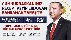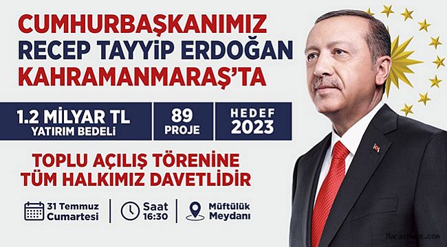 Cumhurbaşkanı Recep Tayyip Erdoğan, bir dizi programa katılmak üzere Kahramanmaraş’a geliyor. 31 Temmuz Cumartesi günü gerçekleştirilecek programlarda ilk olarak AK Parti Kahramanmaraş Genişletilmiş İl Danışma Toplantısı yapılacak. Mehmet Akif Ersoy Kültür Merkezi’nde partililere hitap edecek Cumhurbaşkanı Erdoğan, ardından 16.30’da Müftülük Meydanı’nda Kahramanmaraşlılarla buluşacak. Düzenlenecek programda 1,2 Milyar TL’lik 89 yatırımın açılışı gerçekleştirilecek. Cumhurbaşkanı Recep Tayyip Erdoğan, daha sonra Yedi Güzel Adam Edebiyat Müzesi’nde 81 ilden gelen gençlerle buluşacak.