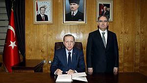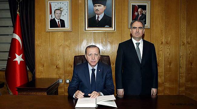 Kahramanmaraş Valiliğini ziyaret eden Erdoğan, burada Vali Özkan tarafından karşılandı. Tören mangasını selamlayan Erdoğan, makamda Vali Özkan'dan kent hakkında bilgi aldı. Ziyaretin anısına Vali Özkan, Erdoğan'a, çini tabak hediye etti. Cumhurbaşkanı Erdoğan, valilik ziyaretini tamamladıktan sonra kendisini bekleyen engelli bir vatandaş ve "Işıklı baba" lakaplı Mehmet Ağagürbüz ile bir süre konuştu.