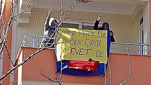 "Çayımız hazır ede, gel sen de çaya da 'evet' de" yazılı pankart asan