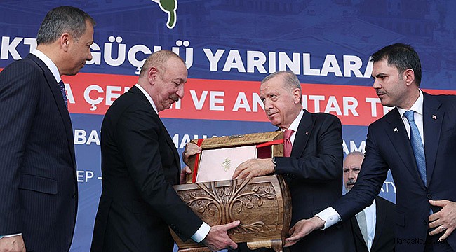 Kahramanmaraş, 19 Haziran Perşembe günü Cumhurbaşkanı Recep Tayyip Erdoğan ve Azerbaycan Cumhurbaşkanı İlham Aliyev’i ağırlayarak tarihi bir güne daha tanıklık etti. Azerbaycan Mahallesi’nde “250 Bininci Afet Konutu Kura Çekim ve Anahtar Teslim Töreni” kapsamında Kahramanmaraş’ta 3 bin 567 konut ve 744 iş yeri olmak üzere deprem bölgesinde toplam 49 bin 56 bağımsız bölümün kura çekimi yapılarak hak sahiplerine teslim edildi. Törende konuşmaların ardından gerçekleşen hediye merasiminde Cumhurbaşkanı Recep Tayyip Erdoğan ve Azerbaycan Cumhurbaşkanı İlham Aliyev’e Çevre, Şehircilik ve İklim Değişikliği Bakanı Murat Kurum tarafından Kahramanmaraş’ın tescilli el sanatlarından ceviz oyma sandığı ve sim sırma hediye edildi. Kahramanmaraş’ın tescilli ürünleri, Cumhurbaşkanı Erdoğan ve Aliyev’in beğenisini kazandı.