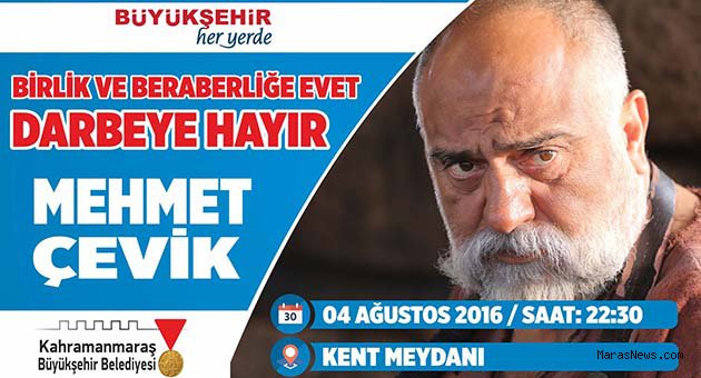 Aynı gün aslen Kahramanmaraş’ın Elbistan ilçesinden olan, Diriliş Ertuğrul Dizisinde Deli Demir karakterini canlandıran Mehmet Çevik saat 22.30’da Kent Meydanı’nda hayranları ile buluşarak Demokrasi Nöbetine destek verecek.