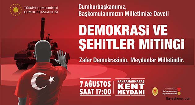 Kahramanmaraş Kent Meydanı’nda 7 Ağustos 2016 Pazar günü saat 17.00’de başlayacak olan Demokrasi ve Şehitler Mitingine Cumhurbaşkanı Recep Tayyip Erdoğan tele-konferans yöntemiyle canlı bağlanacak.