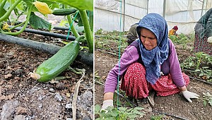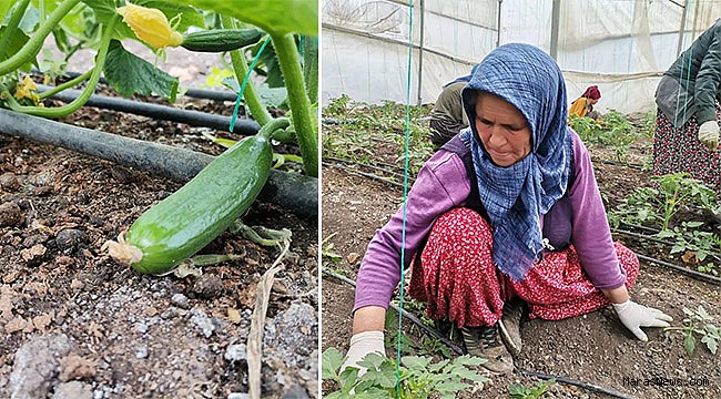 Tarım işçisi kadınlar, seraların içerisinde bir yandan salatalık hasadı yaparken diğer yandan domates fidelerine bakım yaparak, hummalı bir çalışma yürütüyor.