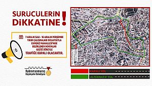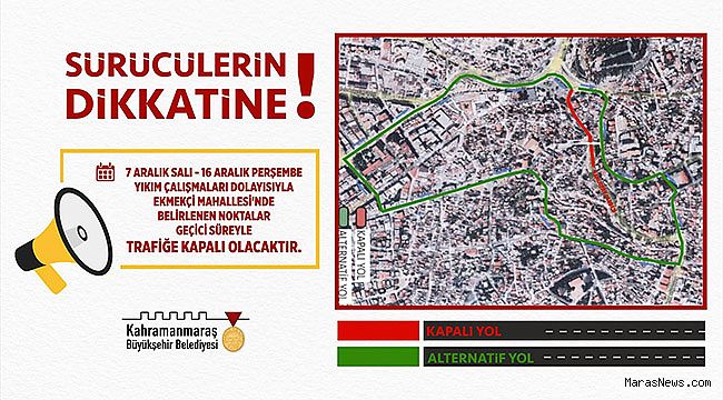 Kahramanmaraş Büyükşehir Belediyesi, gerçekleştirilecek yıkım çalışmaları dolayısıyla Kanlıdere Caddesi’nin trafiğe geçici olarak kapatılacağını duyurdu. Bu kapsamda, Dulkadiroğlu ilçesine bağlı Ekmekçi Mahallesi’ne bağlı Kanlıdere Caddesi, 7 Aralık Salı gününden, 16 Aralık Perşembe gününe değin trafiğe kapalı olacak. Ulaşım Dairesi Başkanlığı tarafından yapılan açıklamada, “Sarayaltı – Kanlıdere – Kaledibi Postane bağlantı yolu genişletme ve yeni köprü çalışması kapsamında gerçekleştirilecek yıkımlar nedeniyle Kanlıdere Caddesi geçici olarak trafiğe kapatılmıştır. Sürücülerimiz Çukuroba Caddesi ve Bektutiye Bulvarı istikametinden ulaşım sağlayabilir” ifadelerine yer verildi.
