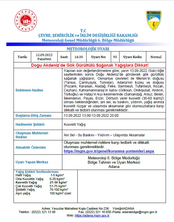 Meteoroloji Genel Müdürlüğü’nden yapılan açıklama da, “Yapılan son değerlendirmelere göre; yarın 13.09.2022 (Salı) öğle saatlerinden sonra Doğu Akdeniz’de görülecek gök gürültülü sağanak yağışların, Osmaniye çevreleri ile Mersin’in doğusu (Tarsus, Çamlıyayla, Toroslar), Adana’nın kuzey ve doğusu (Pozantı, Karaisalı, Aladağ, Feke, Saimbeyli, Tufanbeyli, Kozan, Ceyhan), Kahramanmaraş’ın batısı (Göksun, Onikişubat, Andırın, Türkoğlu) ve Hatay’ın kıyı kesimlerinde (Samandağ, Arsuz, Belen, İskenderun, Payas, Erzin, Dörtyol) yerel kuvvetli (30-60 kg/m2) olması beklendiğinden; ani sel, su baskını, yıldırım, yağış anında kuvvetli rüzgar ve ulaşımda aksamalar gibi olumsuzluklara karşı dikkatli ve tedbirli olunması gerekmektedir.”