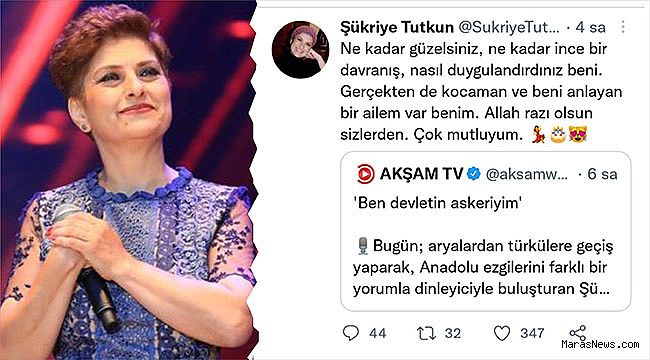 Şükriye Tutkun'un doğum günü için hazırlanan video, yine sanatçının "Ben devletin askeriyim" sözleriyle paylaşıldı. Yapılan sürpriz paylaşımla duygulanan sanatçı, kendisini anlayan insanları adeta ailesi olarak değerlendirerek, "Ne kadar güzelsiniz, ne kadar ince bir davranış, nasıl duygulandırdınız beni. Gerçekten de kocaman ve beni anlayan bir ailem var benim. Allah razı olsun sizlerden. Çok mutluyum" ifadelerine yer verdi.